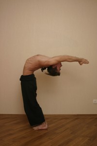 Со вдохом поднимаемся из наклона и вытягиваемся в прогиб назад. Корпус расслаблен, ноги сильные. Стараемся полностью расслабить заднюю поверхность тела и максимально включить в работу переднюю. Вес тела в сердцах стоп, колени подтянуты, Мулабандха подтянута, Уддияна бандха подтянута, диафрагма свободна от напряжения. Шея вытянута без напряжения, плечи отведены в стороны, а лопатки опущены вниз. Вдох!