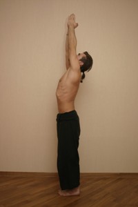 Со вдохом поднимаемся из наклона, вытягиваем руки вверх, направляя взгляд в небо – вытягиваем все тело. Вес по прежнему в сердцах стоп, Мулабандха (корневой замок) подтянута, Уддияна бандха (брюшной замок) подтянута, диафрагма раскрыта , шея вытянута и свободна от напряжения, плечи разведены в стороны а лопатки опущены вниз. Вдох!