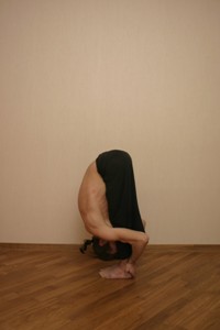 С выдохом возвращаемся из прогиба назад и оставляя корпус максимально цельным и свободным от напряжения, складываемся в наклон в тазобедренных суставах, удерживая вес тела в сердцах стоп и отдавая вес тела в пол по ногам. В конечном варианте расслабленный и свободный корпус лежит на ногах, голова прижата к передней поверхности ног, которые должны быть прямыми в коленях. Мулабандха подтянута, Уддияна бандха подтянута, диафрагма свободна, шея вытянута, плечи и лопатки подаются к тазу. Выдох!