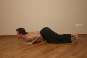 С выдохом одним движением отпрыгиваем назад в высокий упор и опускаем колени и грудную клетку на пол. Пальцы ног упираются в пол, Мулабандха подтянута, Уддияна бандха подтянута, диафрагма раскрыта, ладони упираются в пол на уровне груди, локти прижаты к корпусу, голова смотрит вперед, шея вытянута, плечи и лопатки подаются к тазу. Выдох!