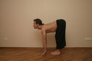 Со вдохом переносим вес тела в руки – подаваясь телом вперед, отталкиваемся ногами от пола, позволяя тазу быть высоко, и одним прыжком опускаем ноги на пол между руками. Оттолкнувшись ногами от пола, вытягиваем позвоночник в прямую линию, параллельно полу, направляя взгляд вперед. Кончики пальцев рук касаются пола перед пальцами ног, руки на ширине плеч. Вес тела в сердцах стоп, (ноги прямые в коленях в конечном варианте) Мулабандха подтянута, Уддияна бандха подтянута, диафрагма раскрыта, плечи и лопатки подаем к тазу. Взгляд направлен в межбровье (шамбхави мудра). Вдох!
